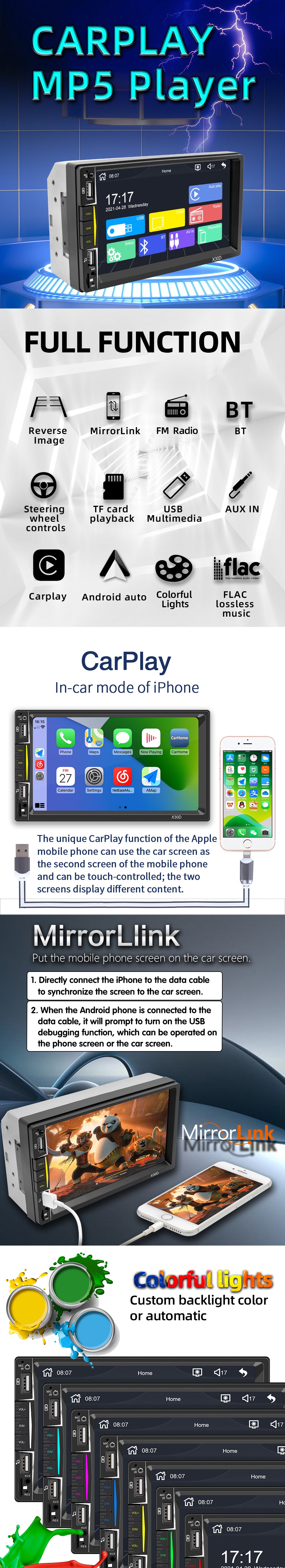 Mirror Link:Support, for iphone and android phone Seven-color key backlights