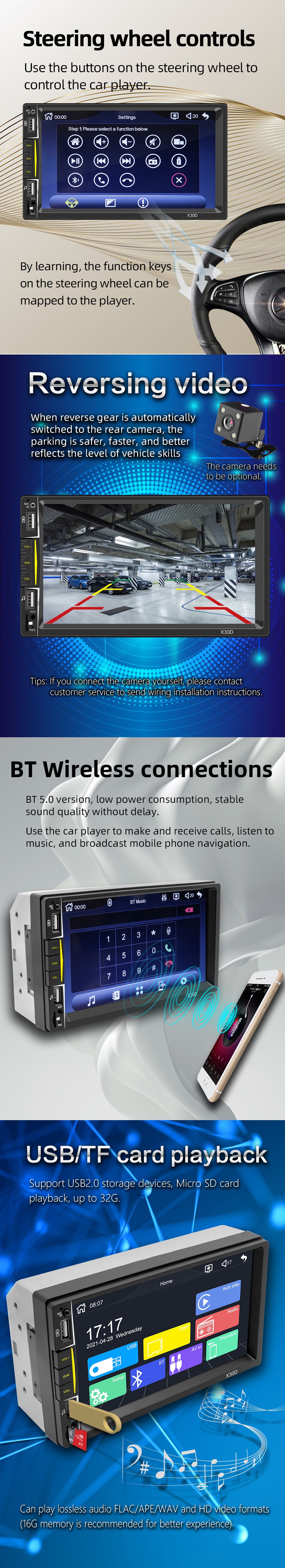Amazon Top Seller double din car stereo with carplay support fm radio bluetooth 5.0 AUX reversing camera input mirror link OS: winceScreen Resolution:800*480, 7 inch HD 5 Points Multi-Touch, with Dual Zone functionBluetooth 5.0 : Bluetooth Hand-free phone call, Synchronize contact...