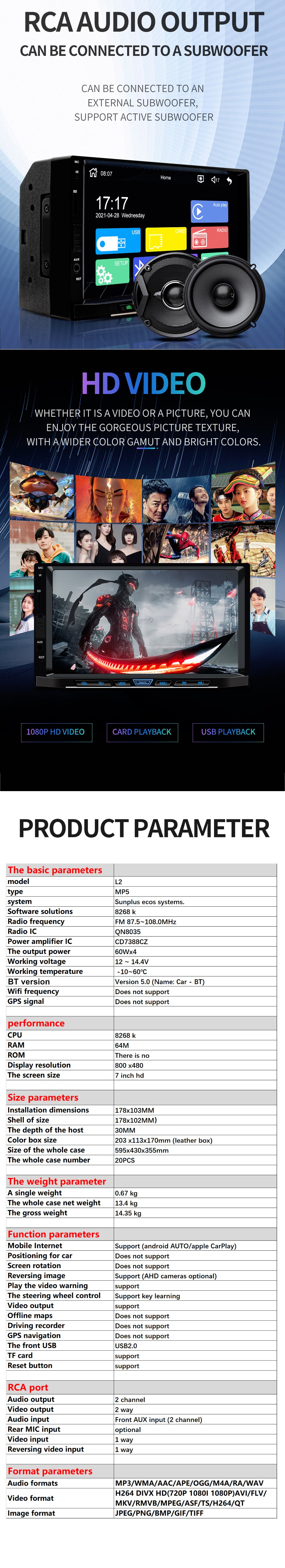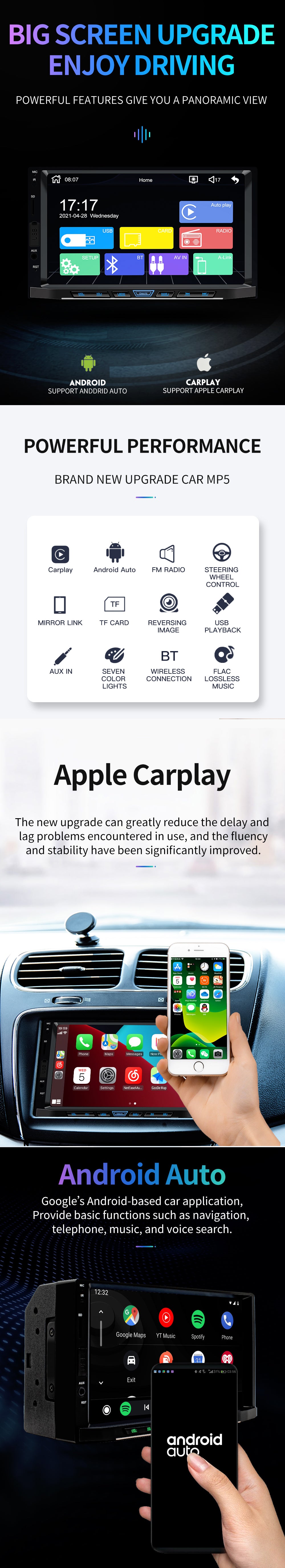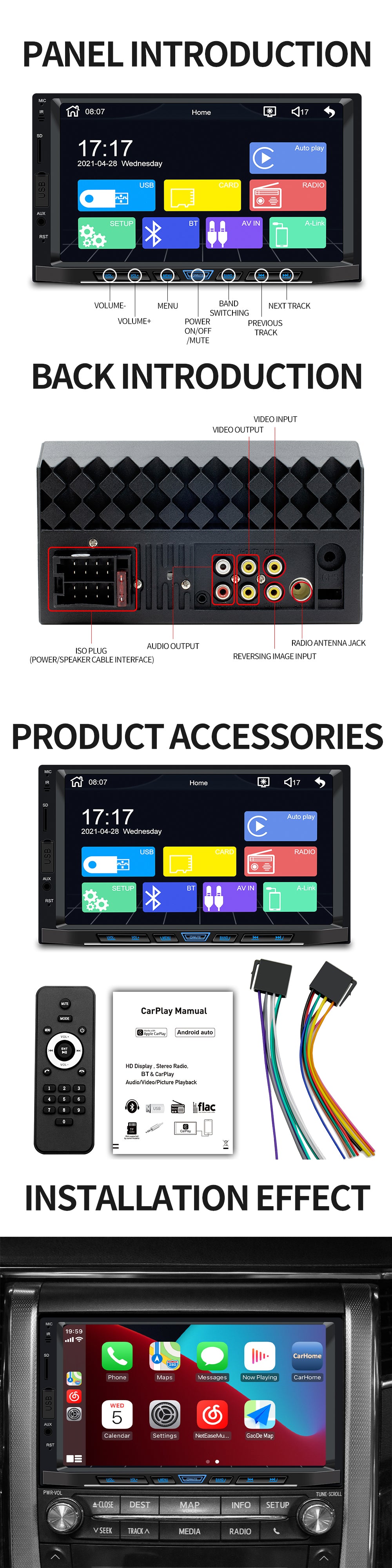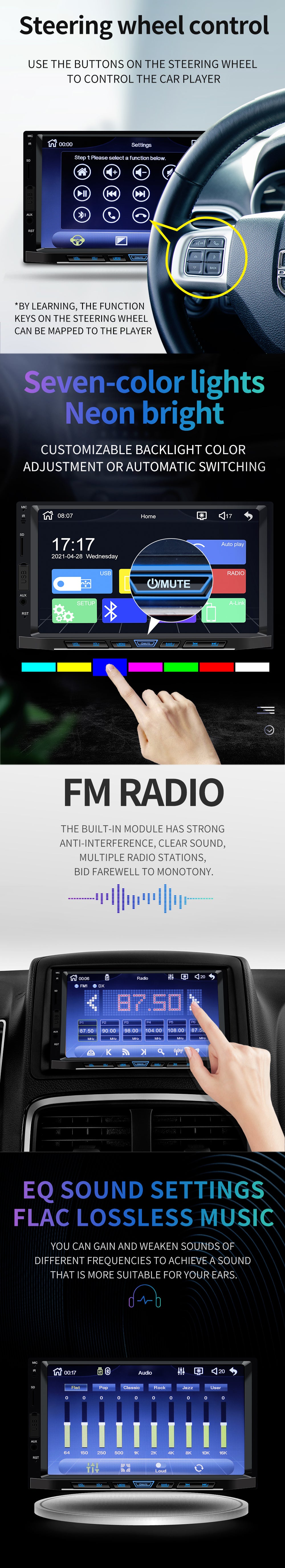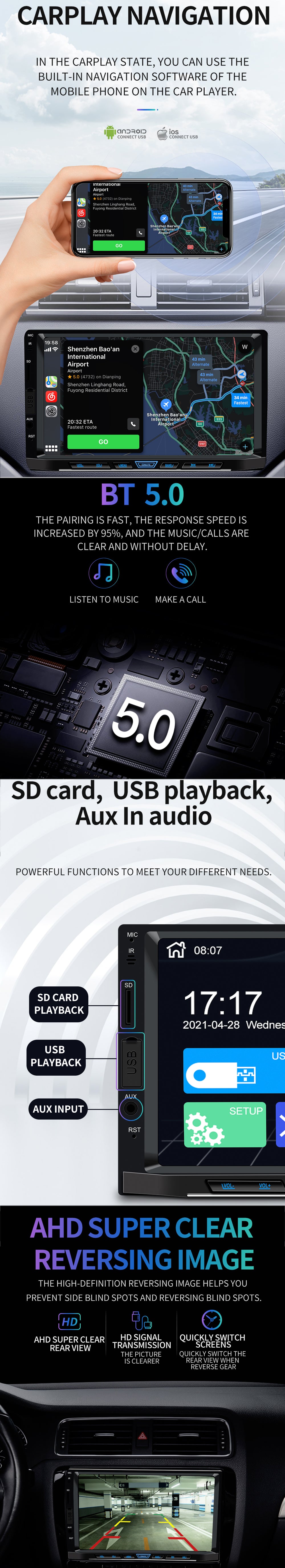 Car stereo manufacturer double din car stereo bluetooth 5.0 with carplay and android auto bluetooth 7 inch capacitive touch screen support fm radio AUX reversing camera input mirror link
